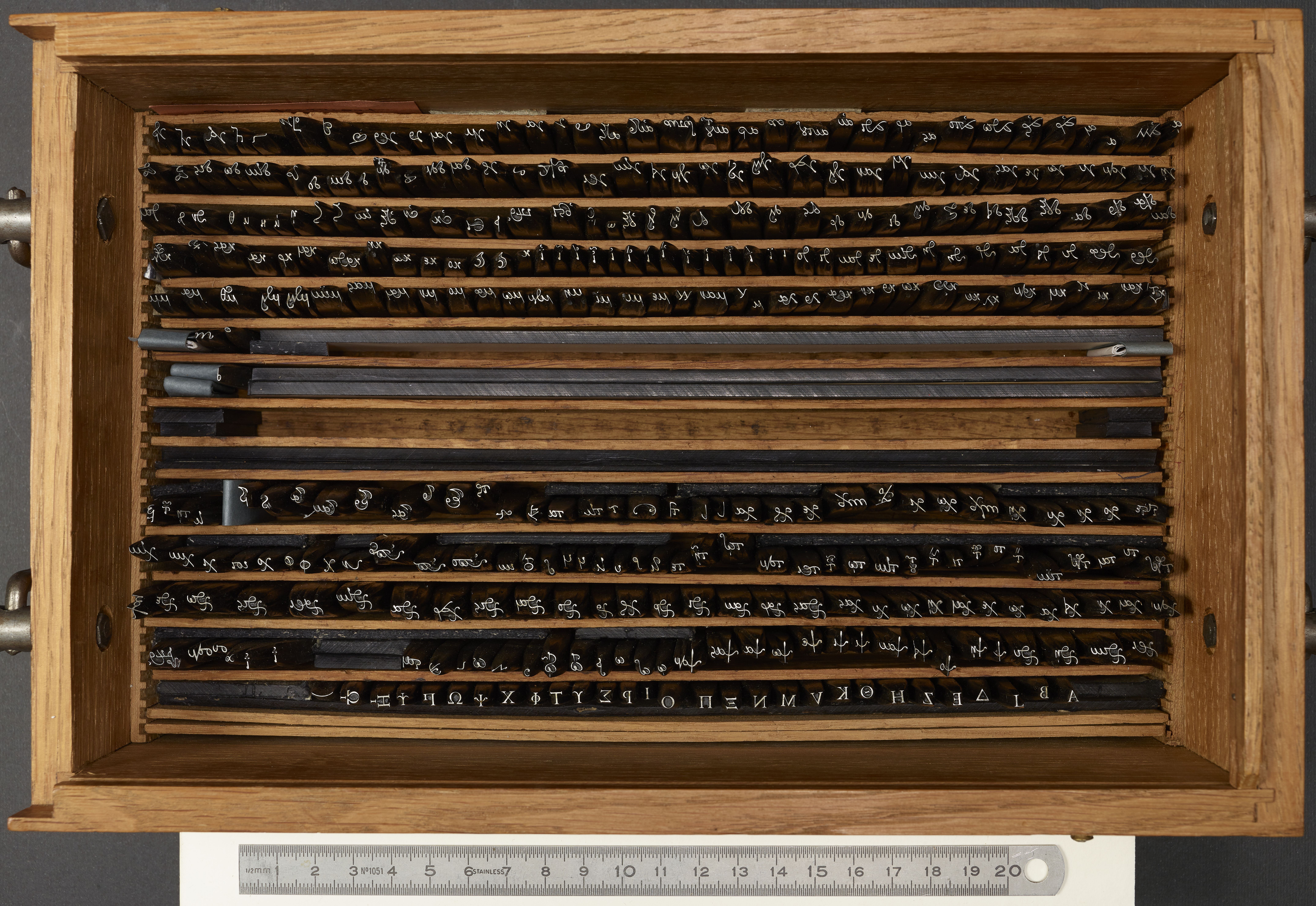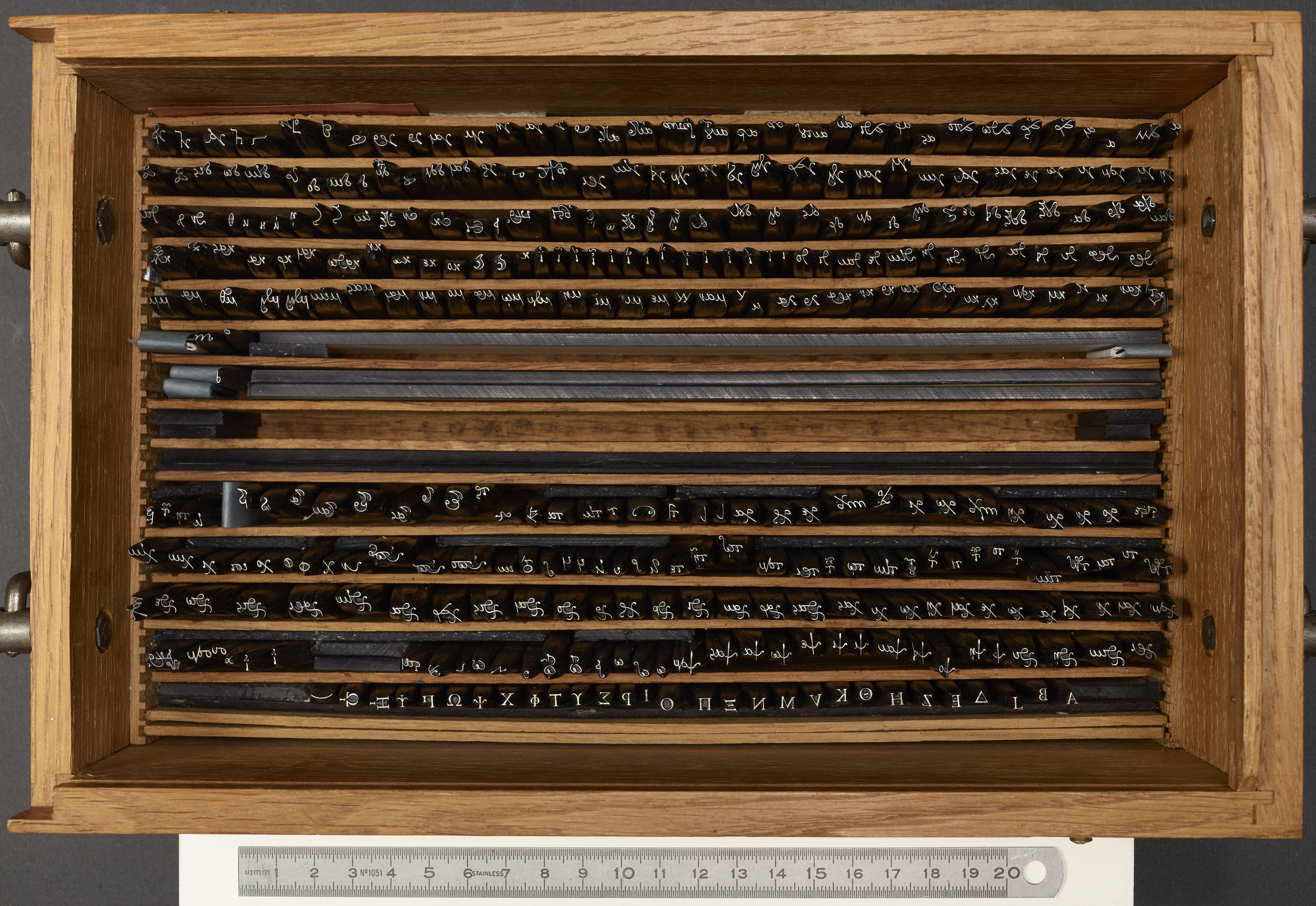Boîte de poinçons typographiques, appelés "Grecs du Roi", ou encore "grecs des Manuscrits" ou "grec Garamont corps 16" à l''Imprimerie nationale. Il s''agit des poinçons commandés en novembre 1540 à Claude Garamont.