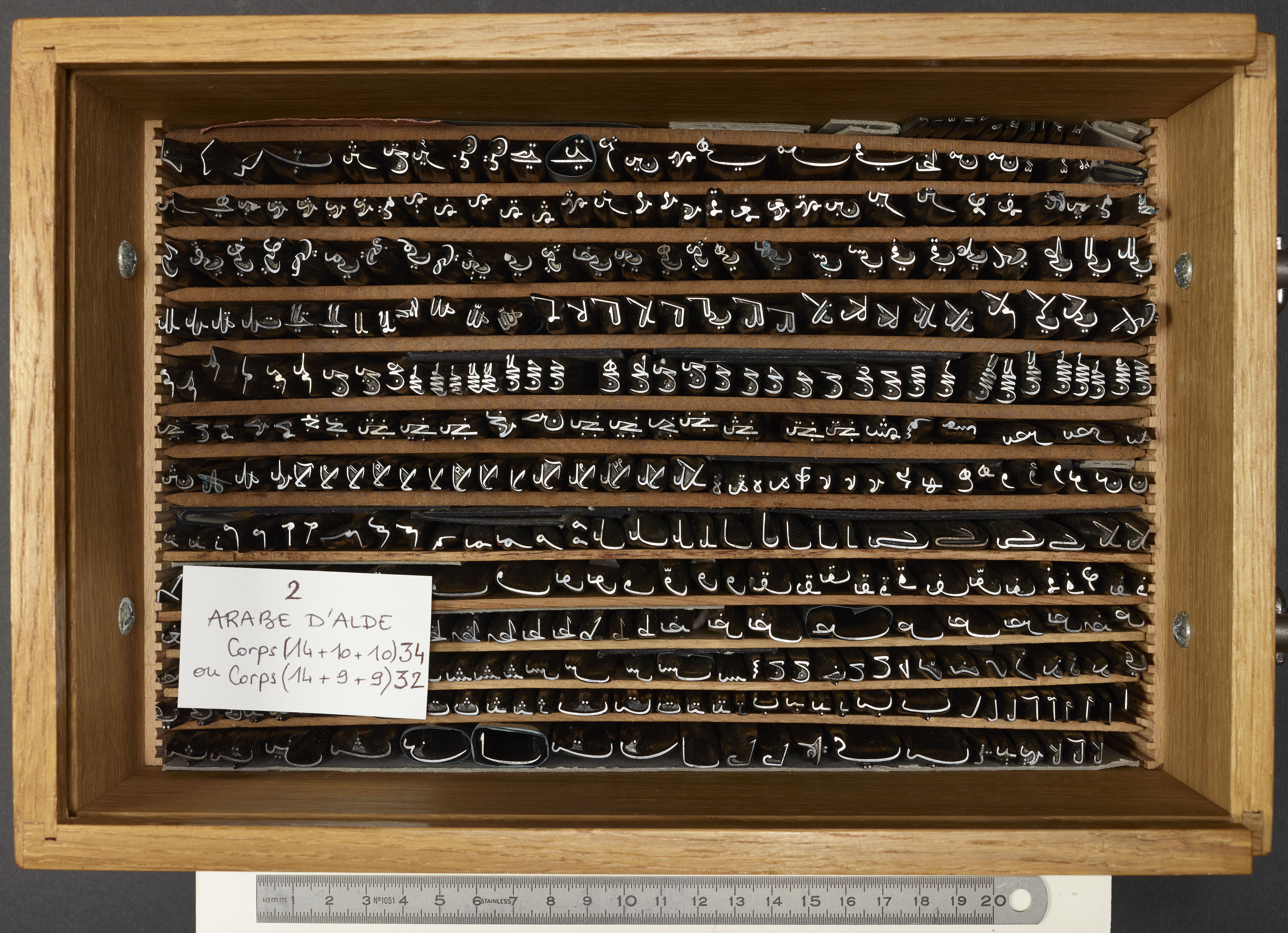 392 poinçons (corps 32, selon la nomenclature en usage à l'Imprimerie nationale). Ce caractère a été gravé en 1591 par Jean Cavaillon (formé par Robert Granjon) pour la Tipografia Medicea, à partir de modèles tracés par Raimondi. Les comptes de la Tipografia Medicea décrivent cette typographie comme un "carattere arabo grande". La dénomination "arabe d'Alde" repose sur une tradition née à l'Imprimerie nationale.